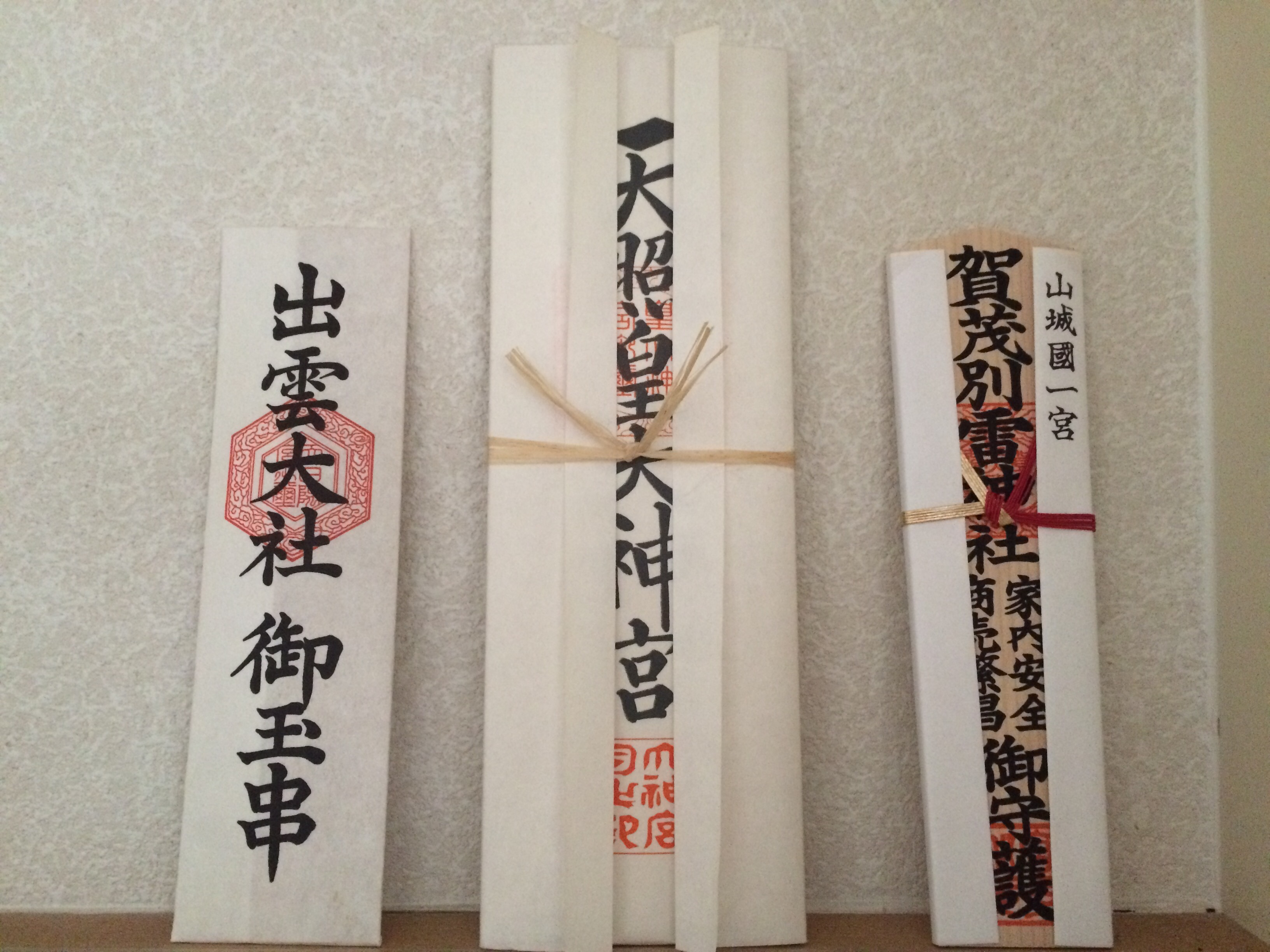 4年間そのままでしたが、今年息子卒業で社会人になります。文系なので、卒業提出したら学校終わりで、まだ帰省したままですが。新しく、先日京都の上賀茂神社でいただいた、お札と入れ替える事に。上賀茂神社は、氏神様のところに置く事に。